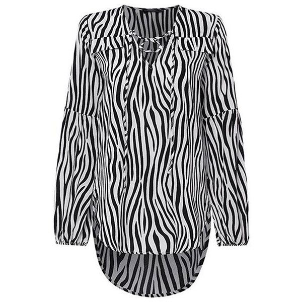 Sexy Lace-up V-neck Lantern Sleeve High-low Hem Printed Blouse