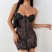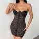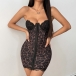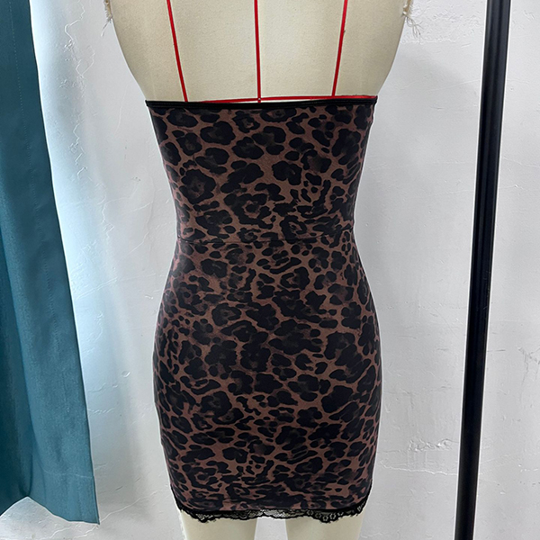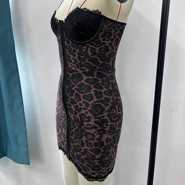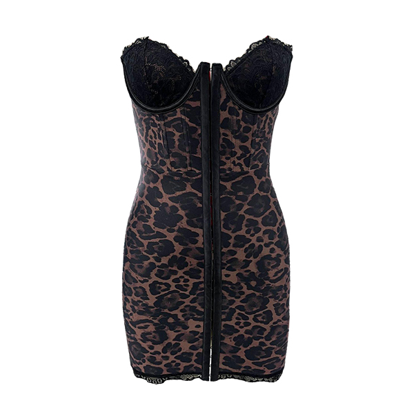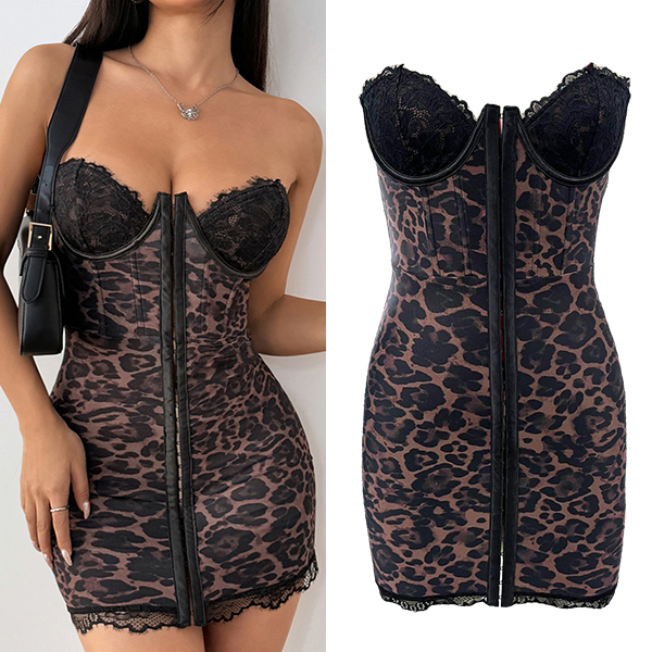 Sexig axelbandslös spetsklänning i leopardmönster med dekorativa spännen framtill