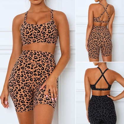 Sexy Leopard Printed Sports Bra + Shorts Two-piece Set
