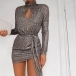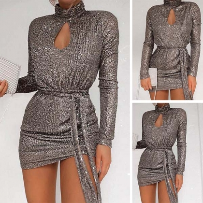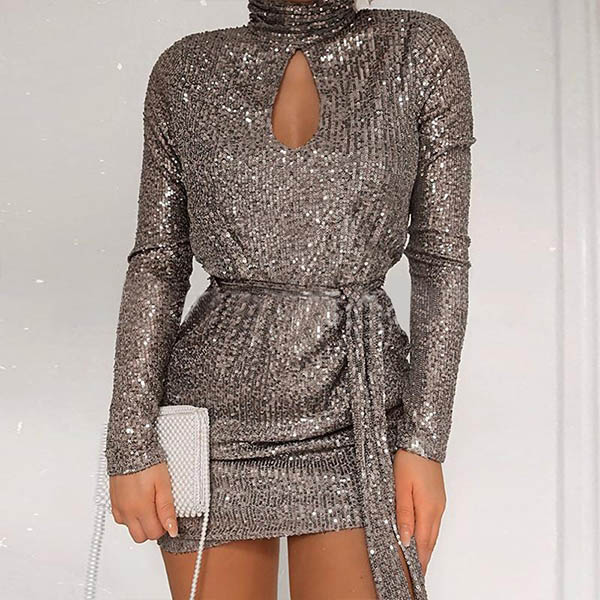 Sexy Long Sleeve Mock Neck Hollow Out Sequin Dress