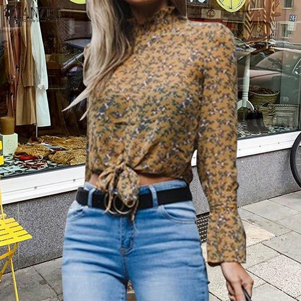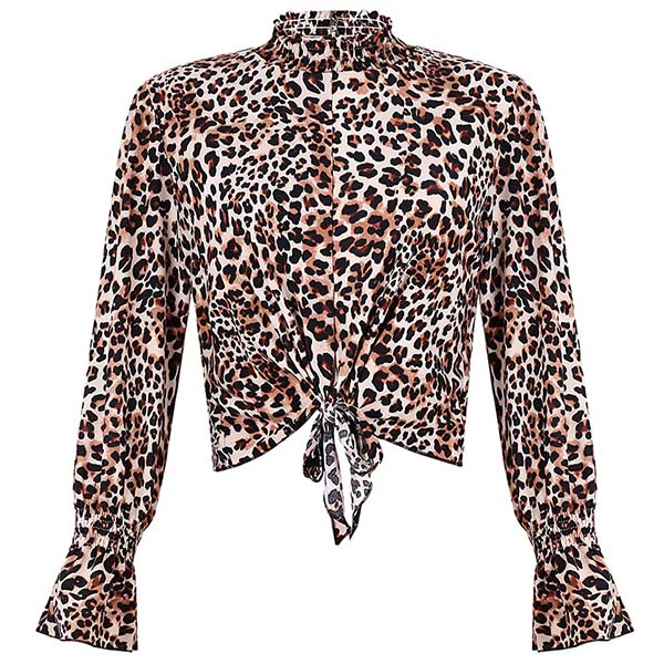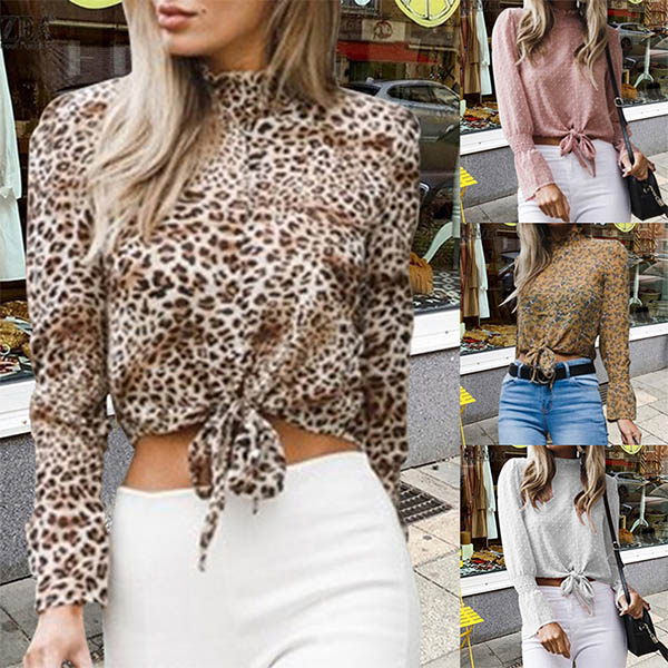 Sexig långärmad Mock Neck Snörning Fåll mönstrad Crop Top