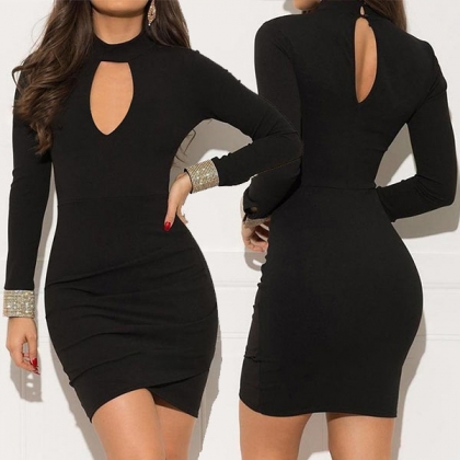Sexy Long Sleeve Mock Neck Slim Fit Hollow Out Dress