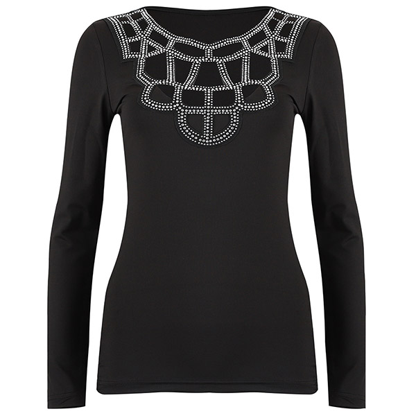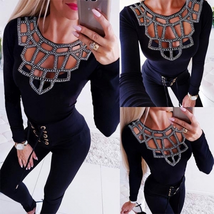Sexy Long Sleeve Round Neck Hollow Out Rhinestone Spliced T-shirt