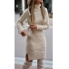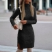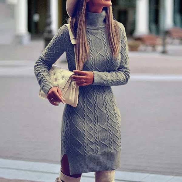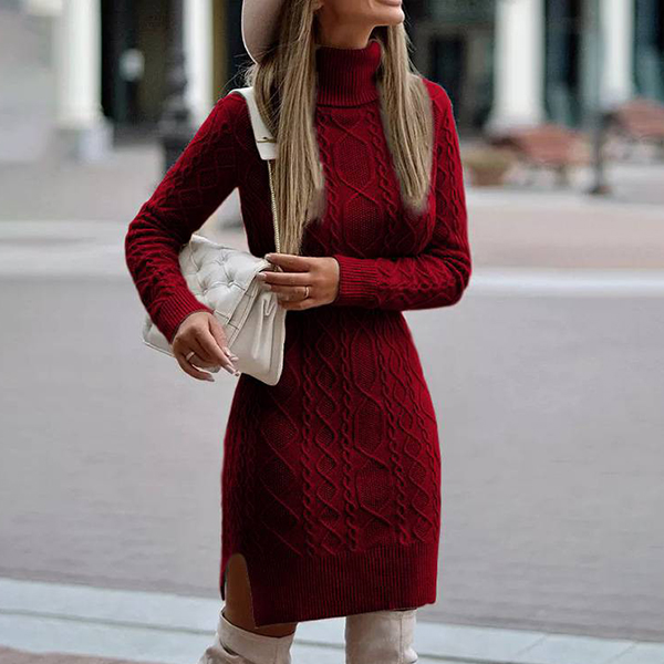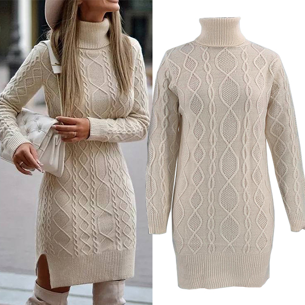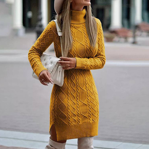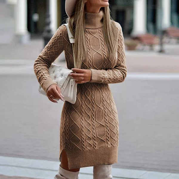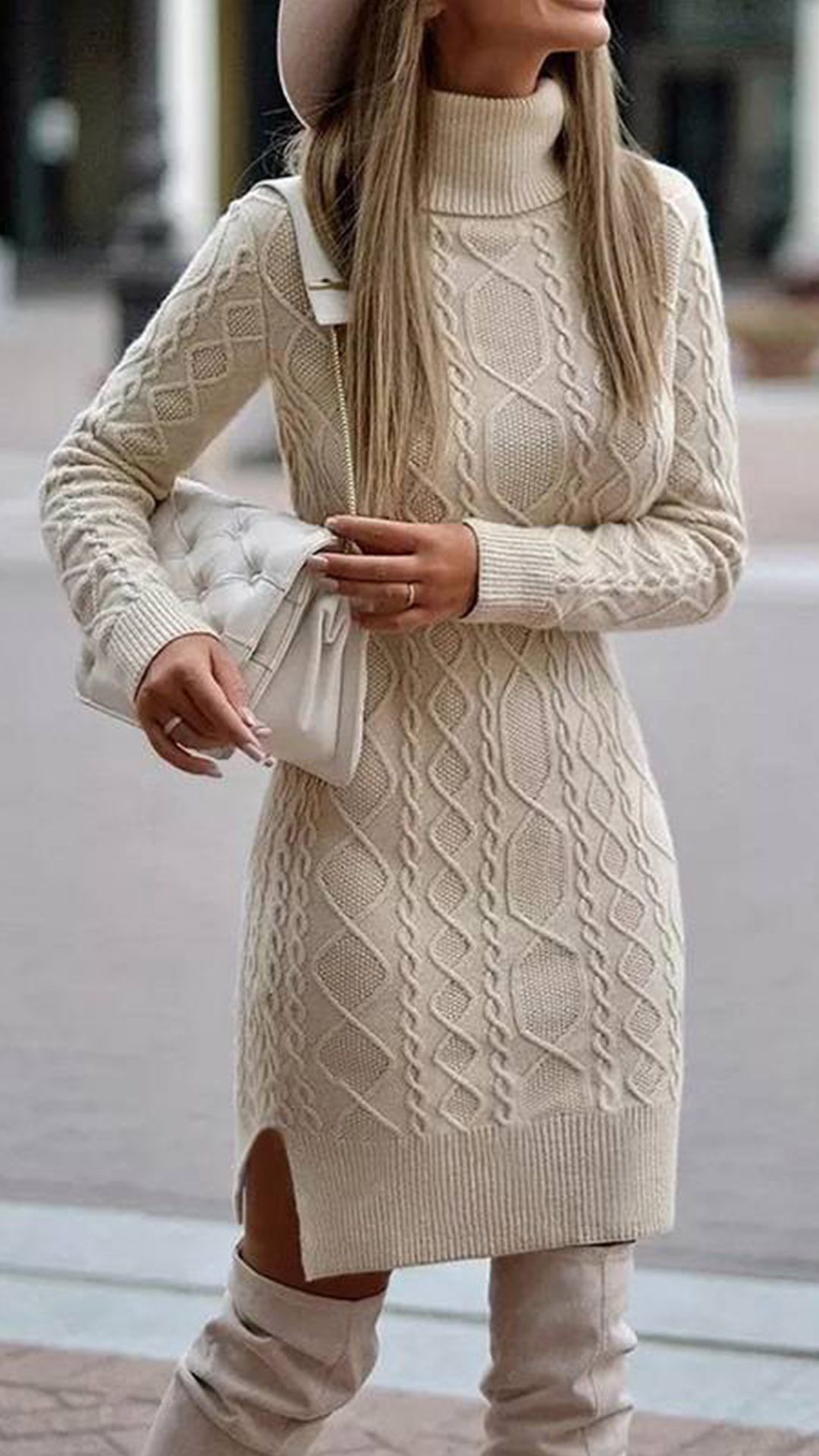 När dagarna blir lite kalla kan den här tröjaklänningen lätt slå dig. Den här klänningen är gjord i en enfärgad färg, med lång ärm, polotröja och en passformig siluett, och den kan definitivt visa upp din smala figur. Du kan bara matcha med dina over-the-knee boots för att få en charmig look.