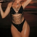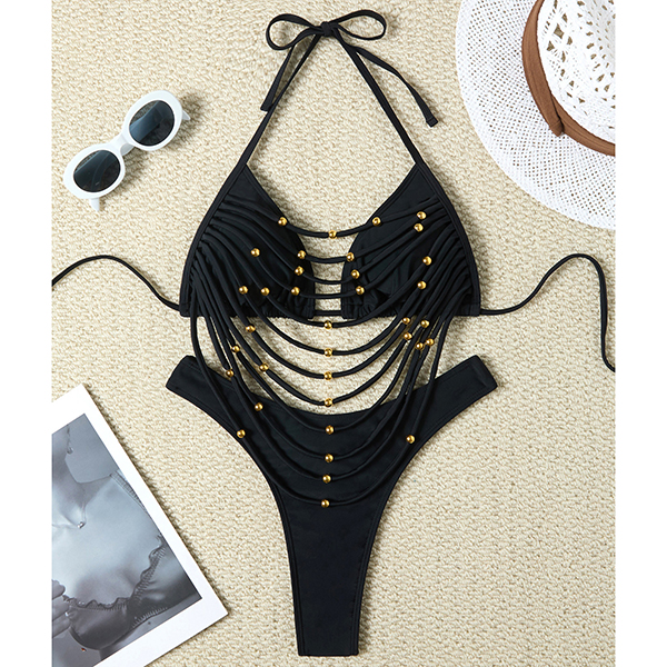 Gör ett fantastiskt intryck på strandklubben eller vid poolen med detta svarta, pärlbesatta bikiniset med tofsar. Denna tvådelade ensemble suddar ut gränsen mellan badkläder och kroppssmycken och erbjuder en look som är både edgy och onekligen glamorös. Setet skapar den visuella illusionen av en monokini samtidigt som det behåller tvådeladens mångsidighet. Hoppas du gillar det.