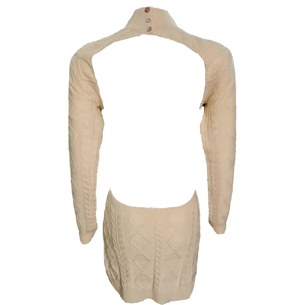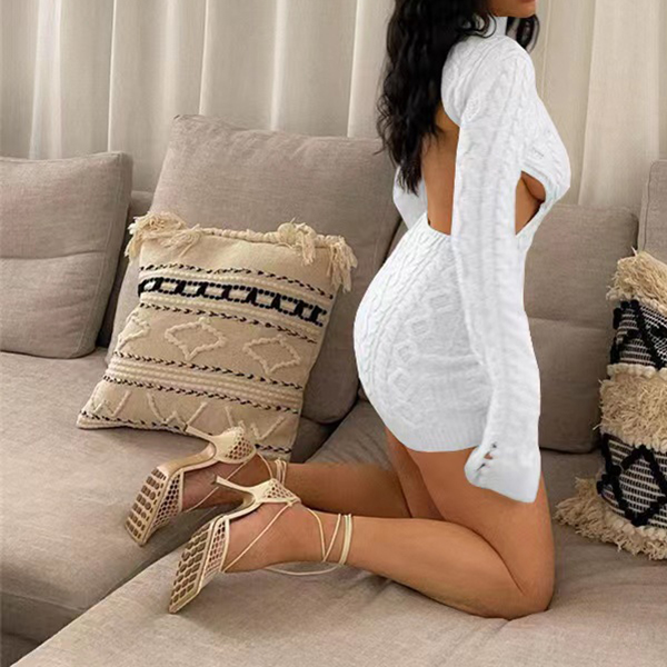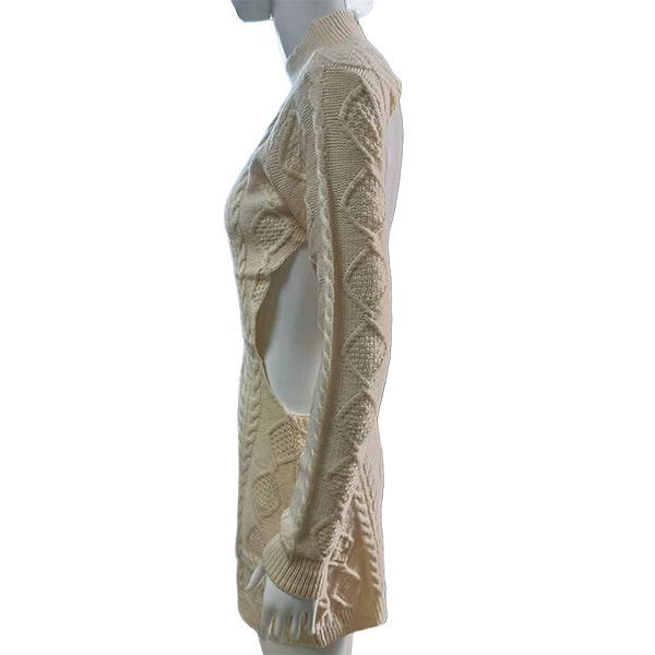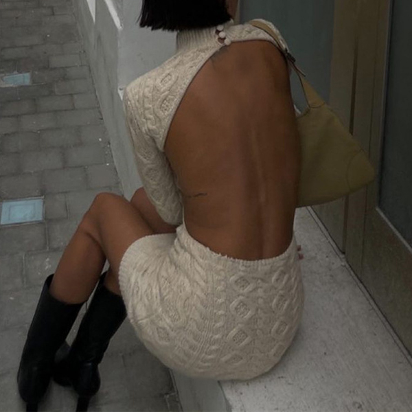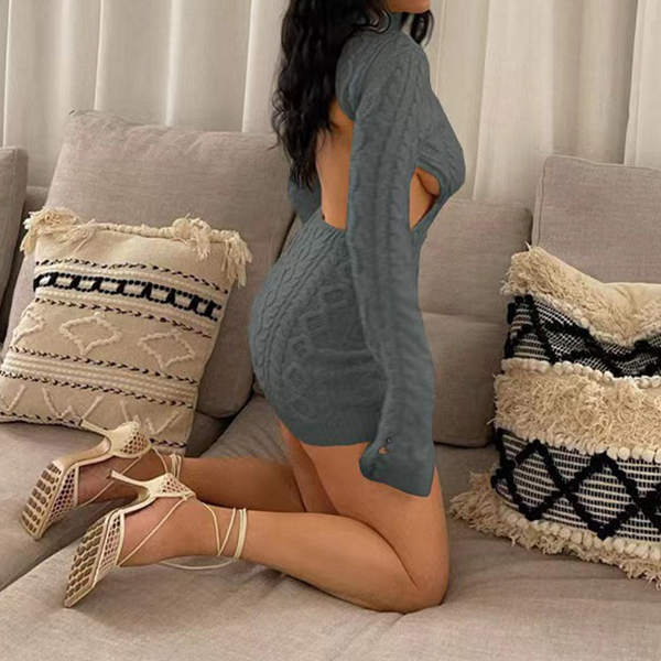 Upptäck vår exklusiva kabelstickade tröjklänning med fuskpolokrage och rygglös design – ett hantverksmästerverk som förenar värme, elegans och en oväntad twist. Den klassiska kabelstickningen skapar djup och struktur, medan den sofistikerade fuskpolokragen ger en polerad look och behaglig täckning. Den djärvt rygglösa silhuetten tillför dramatik och förförisk kontrast, perfekt balanserad av långa ärmar som håller stilen elegant. Denna tröjklänning sticker ut från mängden med sin unika kombination av tidlös design och modern sensualitet.- Kabelstickad med handgjord känsla: Ger lyxig textur och exklusiv detaljrikedom - Fuskpolokrage: Bekväm värme och sofistikerad finish - Rygglös konstruktion: Djärv och feminin touch som drar blickarna till sig - Långärmad, slimmad passforM: Perfekt balans mellan täckning och elegans Idealisk för kvällstillfällen, dejter, vinterfester och vardagslyx i säsongens kallare månader. Lyft din garderob med en statement-piece som kombinerar klassisk stickteknik med trendig kontrast och gör varje entré oförglömlig.