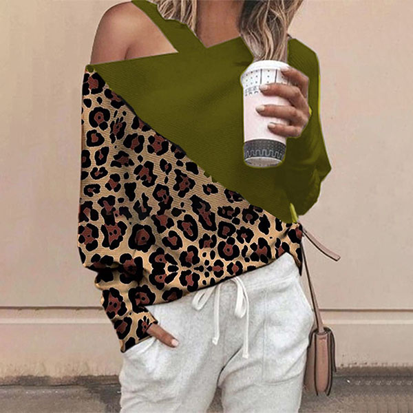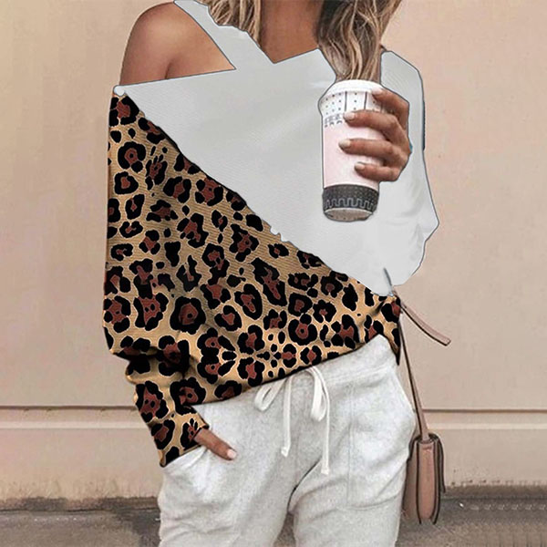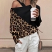 Sexy Oblique Shoulder Long Sleeve Leopard Spliced Top