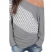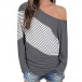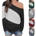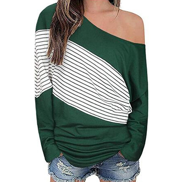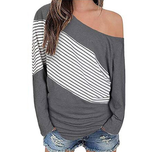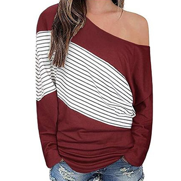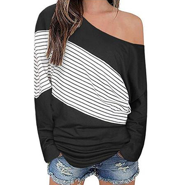 Sexy Oblique Shoulder Long Sleeve Striped Spliced T-shirt