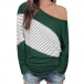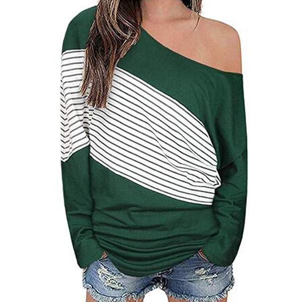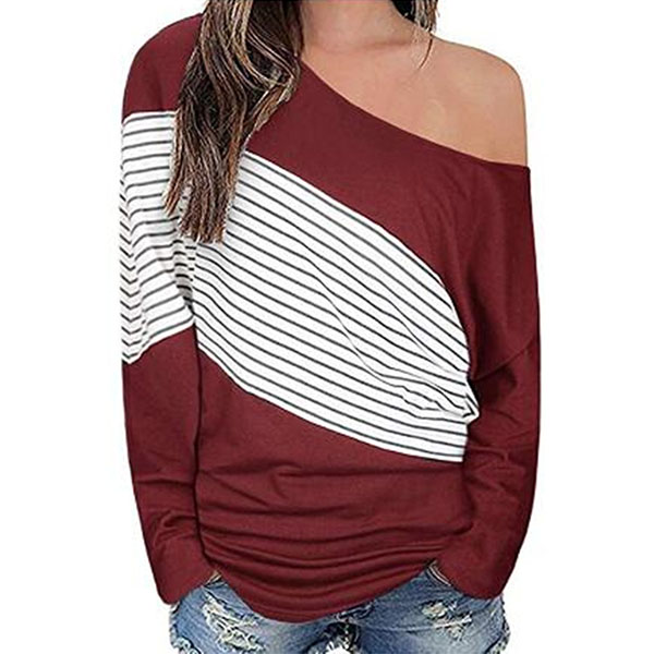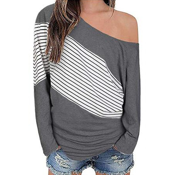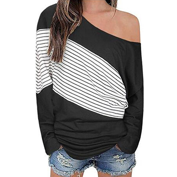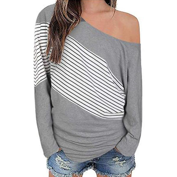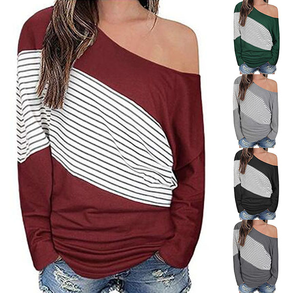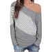 Sexy Oblique Shoulder Long Sleeve Striped Spliced T-shirt