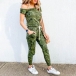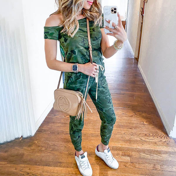 When you have to time for your wardrobe matching,then this jumpsuit can be a perfect solution. The camouflage printed details make this piece look so eye-catching,while the oblique shoulder design can offer you a sexy and flirty look. When you go out with this little piece,you can easily win more eyes.