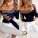 Combines of sexy and flirty vibes,this t-shirt can help you arouse more attention. Its alluring design details like off-shoulder boat neck,hollow out and rhinestone design will make this piece look more attractive. Your style can have a boost when you wear this little piece.