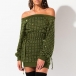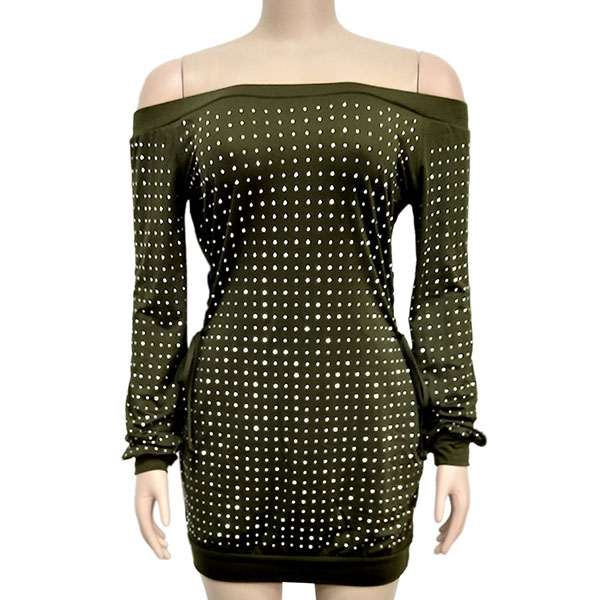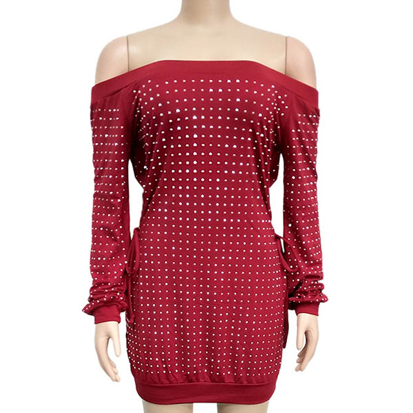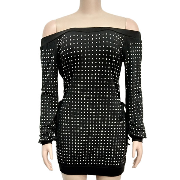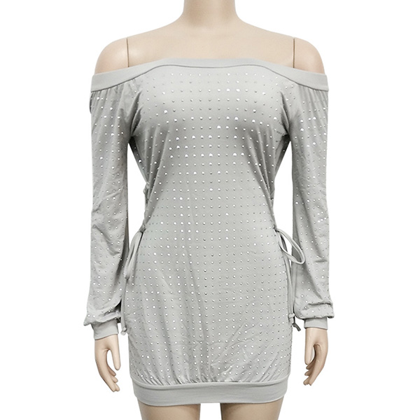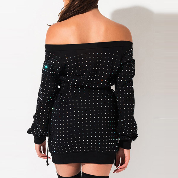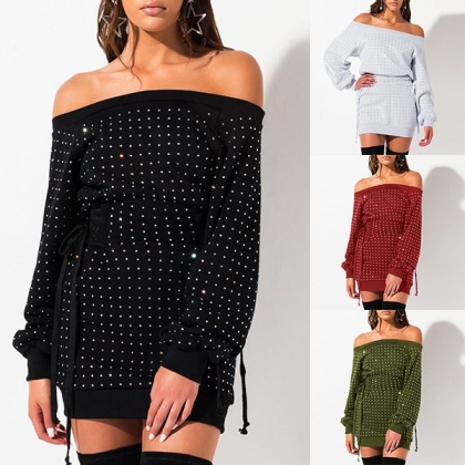 Sexy Off-shoulder Boat Neck Long Sleeve Lace-up Rhinestone Dress