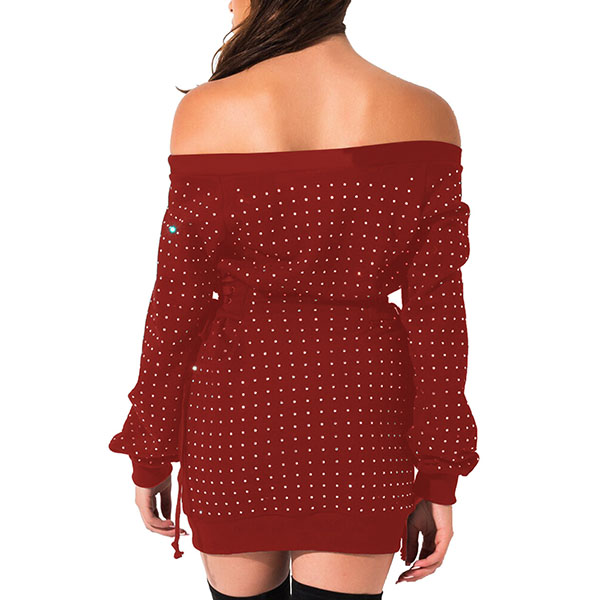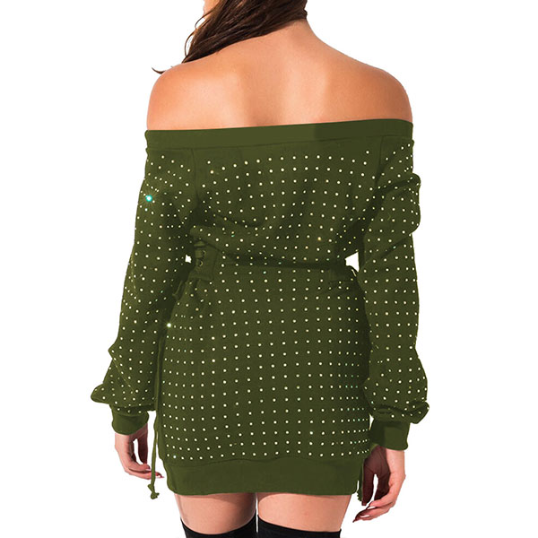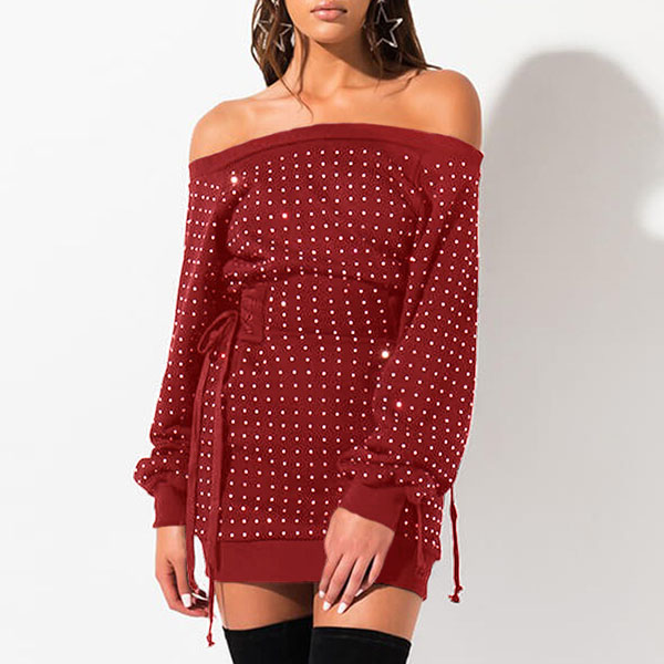 Want to make the maximum impact with minimal effort? Then slip into this dress. The off-shoulder boat neck and rhinestone details make this piece look so sexy and shinning,while the lace-up design will help showcase your slender figure. When matching with your over-the-knee boots,you can look stunning enough!