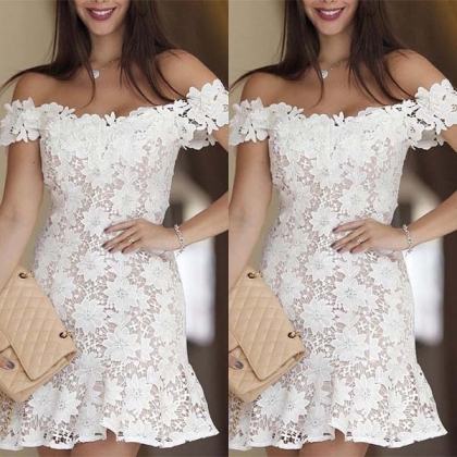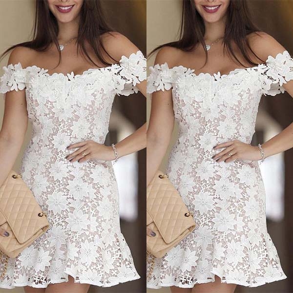 Exude your sexy and flirty side through this lace dress. The off-shoulder boat neck and ruffle hem