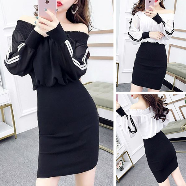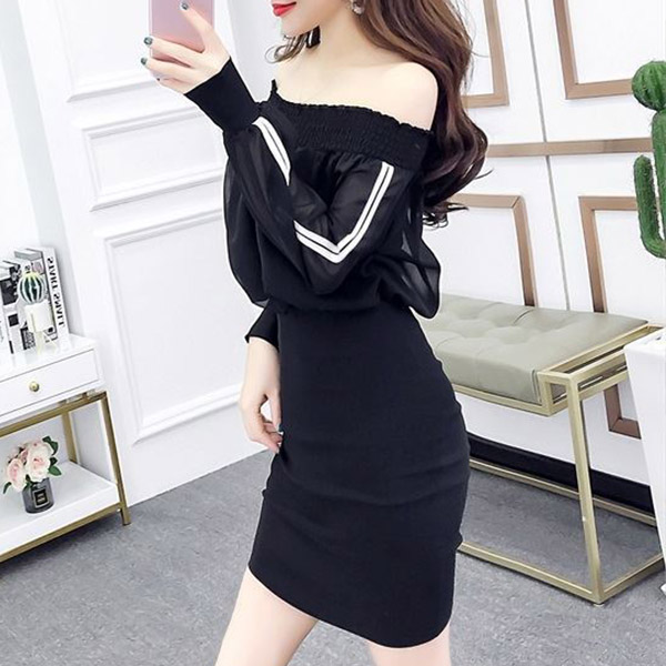 You're sure to turn some heads when you dress yourself up with this dress. The off-shoulder boat neck design gives you the chance to showcase your charming shoulder and seductive collarbone,while the striped spliced design at the sleeve part will enrich the design style. No matter for your night dating or weekend out,you can trust in this dress to express your beauty and femininity.