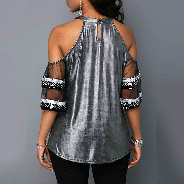 This top can easily exude your sexy and flirty side! Its alluring design details like off-shoulder,gauze and sequin spliced design make this piece look more stunning and seductive. When you wear it,you can easily win more eyes.