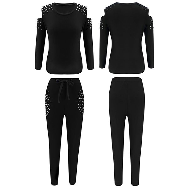 Sexigt off-shoulder-set med långärmad pärlöverdel och byxor