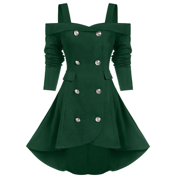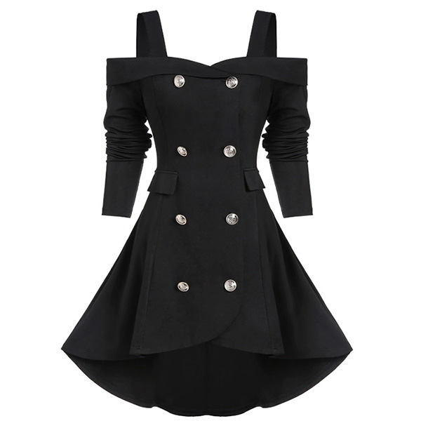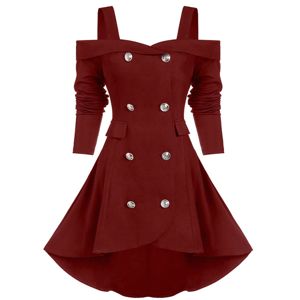 For a dating look that is full of sweet and charming vibes,we suggest you choosing this dress! Solid color style,the off-shoulder design can lend you a sexier look,while the double-breasted and high-low hem design will make this piece more attractive. Just need to match with your heels,then you can look beautiful enough!