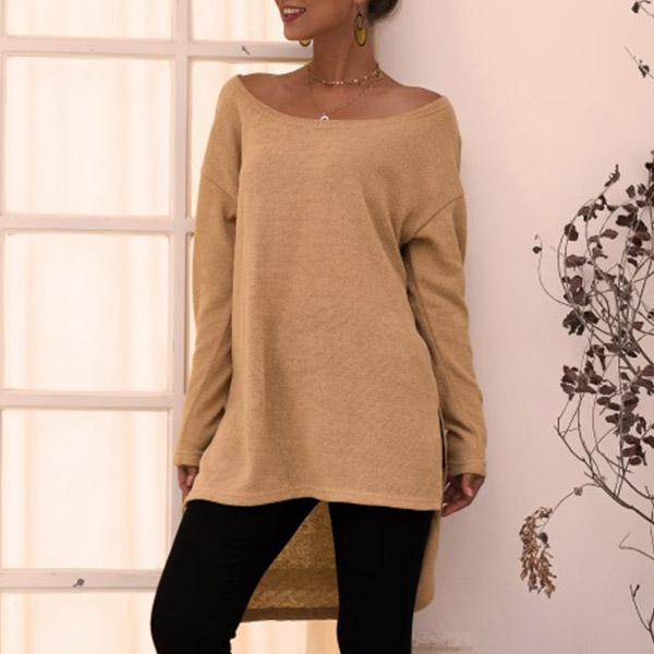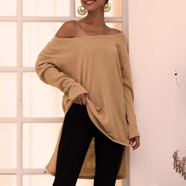 - Sexy Off-shoulder Long Sleeve High-low Hem Solid Color Knit Top