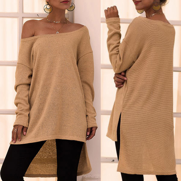 You can easily showcase your chic and stylish personality through this knit top. Solid color style,the off-shoulder and high-low hem design are the highlights,which make this piece look so sexy and distinctive. You can match it with a tight pants or leggings to have a wonderful day!