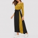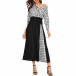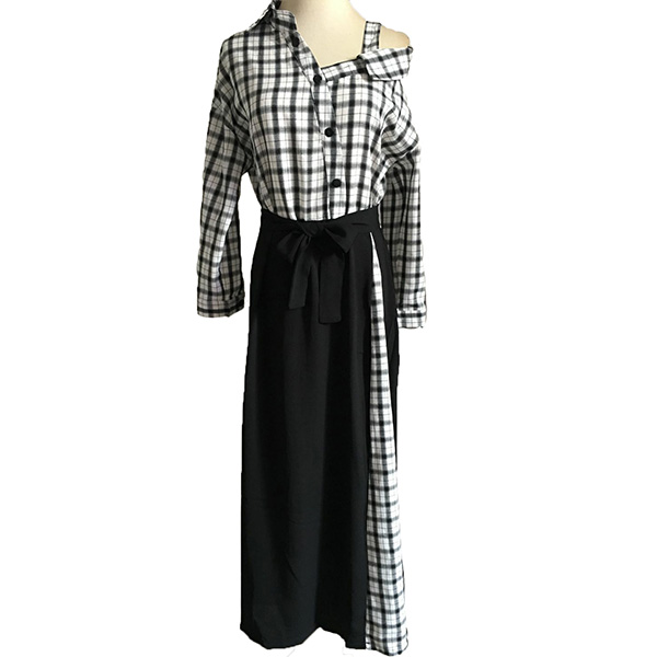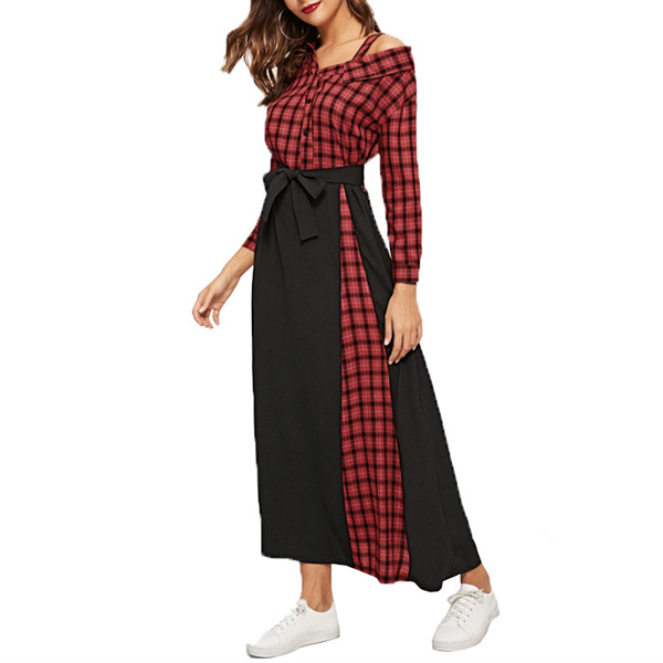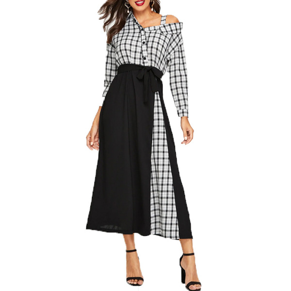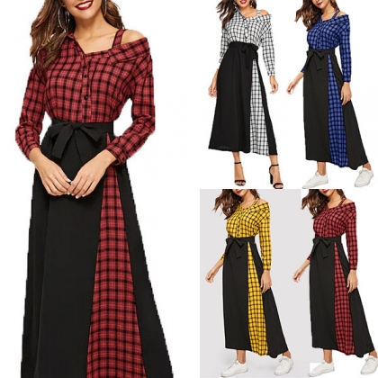 Sexy Off-shoulder Long Sleeve High Waist Plaid Spliced Dress