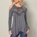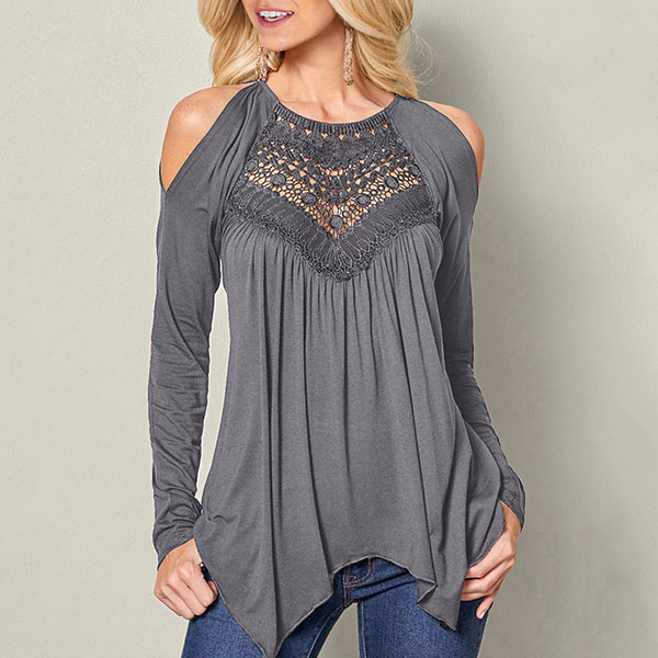 Make your wardrobe have an update by adding this chic top. Solid color style,the off-shoulder,irregular hem and lace spliced details make this piece full of flirty and feminine vibes. You can trust in this little piece to boost your style and charm.