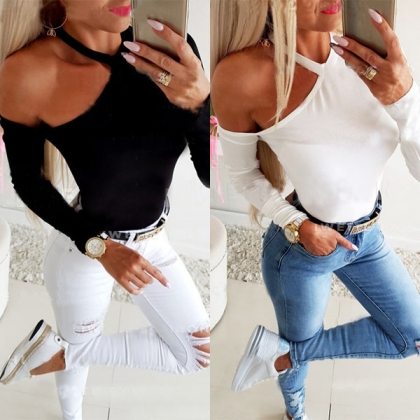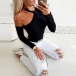 Sexy Off-shoulder Long Sleeve Solid Color Slim Fit T-shirt