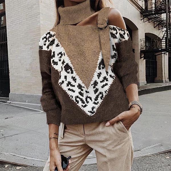 Sexy Off-shoulder Long Sleeve Turtleneck Leopard Spliced Sweater