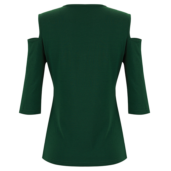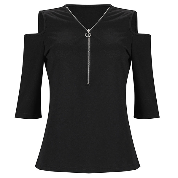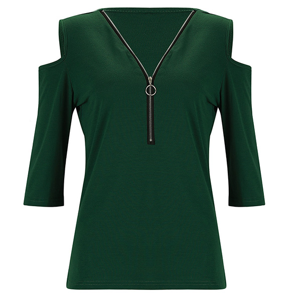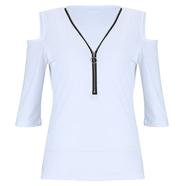 Combines of cozy and sexy vibes,this t-shirt is worth to arouse your attention. Solid color style,the off-shoulder and zipper v-neck design break the simple and dull design style. Meanwhile,it knows how to exude your femininity. Like it? Then buy one!