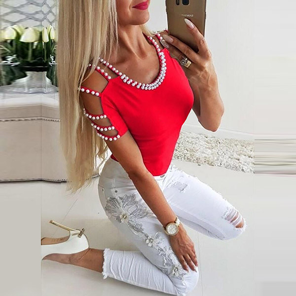 You are sure to arouse more eyes when you slip into this t-shirt! What makes this piece look so sexy and attractive? It owes to the off-shoulder and beaded details. Meanwhile,its soft and breathable fabric can offer you a comfortable day. So why not boost your charm with this piece?