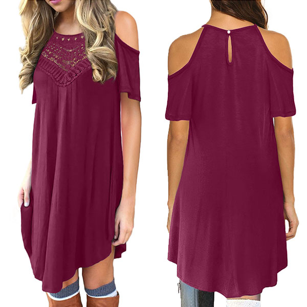 Combines of cozy,sexy and feminine vibes,this dress can easily strike your mind. Comes with a solid color,the off-shoulder,irregular hem and lace spliced details make this piece look so distinctive and attractive. For your night dating or weekend out,you can trust in this dress to help you grab more appeal.