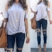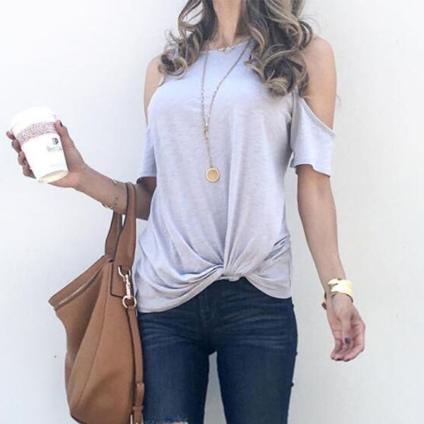 Combines of stylish and flirty vibes,this t-shirt can easily strike your mind. What makes this piece look so stylish and attractive? It owes to the off-shoulder and twisted hem design. Meanwhile,its soft and breathable fabric can give you a comfortable day. Like it? Then buy one!