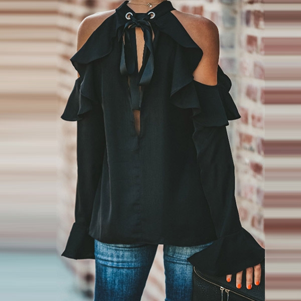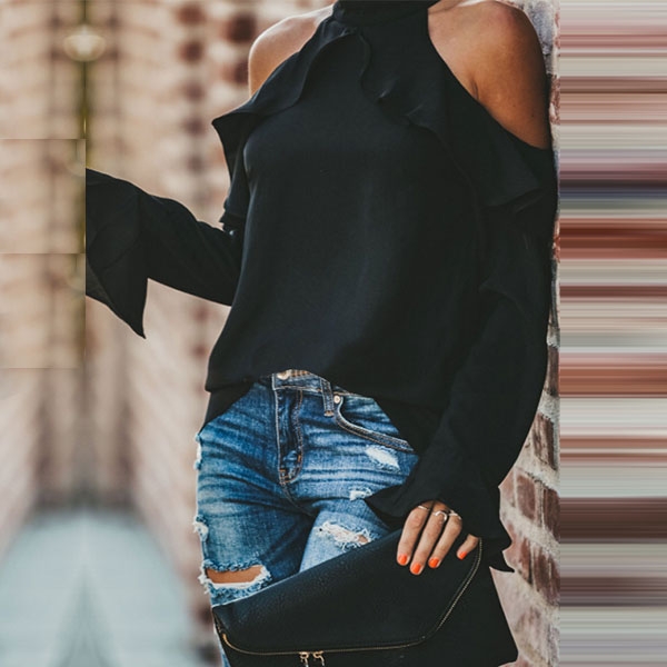 This top comes with a classic yet stylish black tone,its off-shoulder,trumpet sleeve and ruffle design will