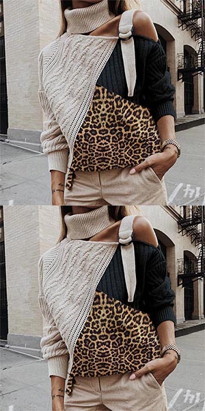 I promise you can be attracted by this sexy and chic sweater. The contrast color element and leopard printed details will make this piece look more eye-catching,while the off-shoulder design can lend you a sexier look. When the days get a little cold,this sweater can be your perfect partner.