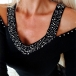 Add a dash of sexy and flirty vibes to your wardrobe with this t-shirt. Its alluring design details like off-shoulder,v-neck and rhinestone spliced details make this piece look so eye-catching,the fit silhouette design can showcase your perfect body-line. Simply matching with your favourite bottom to finish a charming look.