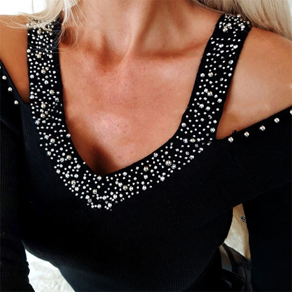 Sexy Off-shoulder V-neck Long Sleeve Rhinestone Spliced T-shirt
