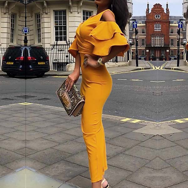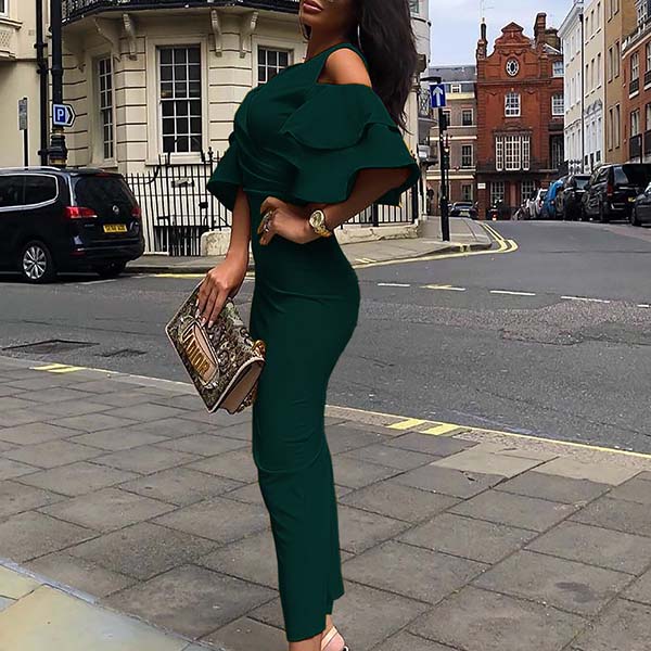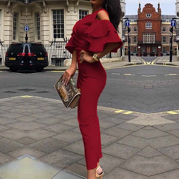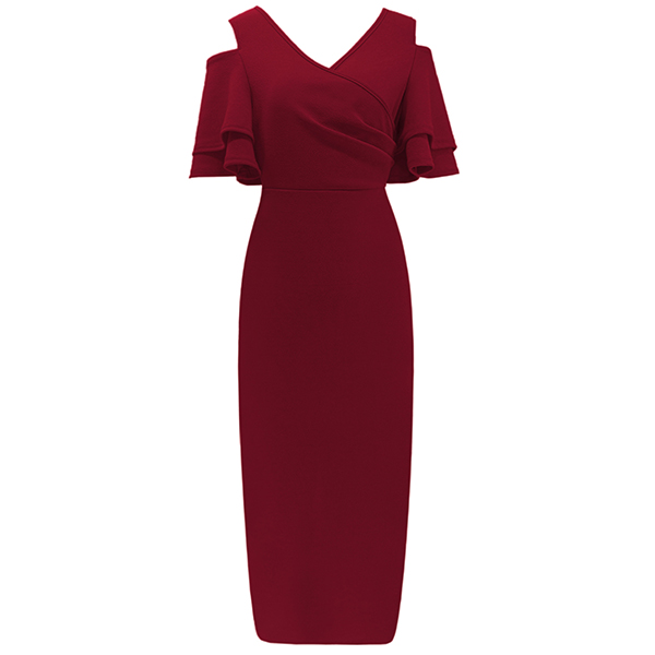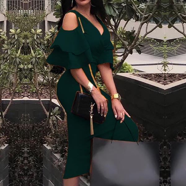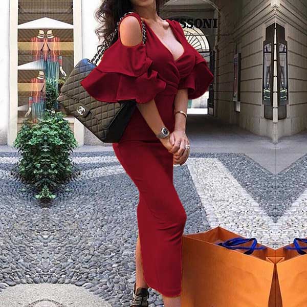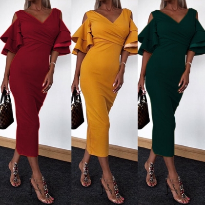 Sexy Off-shoulder V-neck Lotus Sleeve Slim Fit Party Dress