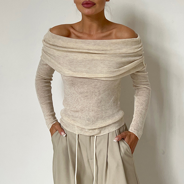 Den här skjortan har en elegant off-shoulder-design och sofistikerade långärmade detaljer för modern, feminin elegans. Kombinera med högmidjade byxor och fina accessoarer för en romantisk och sofistikerad look.