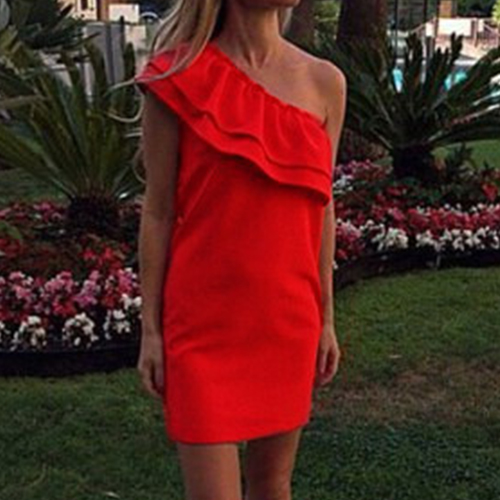 on this one. One-shoulder style,with an elegant solid color,sweet flouncing and a fit silhouette,