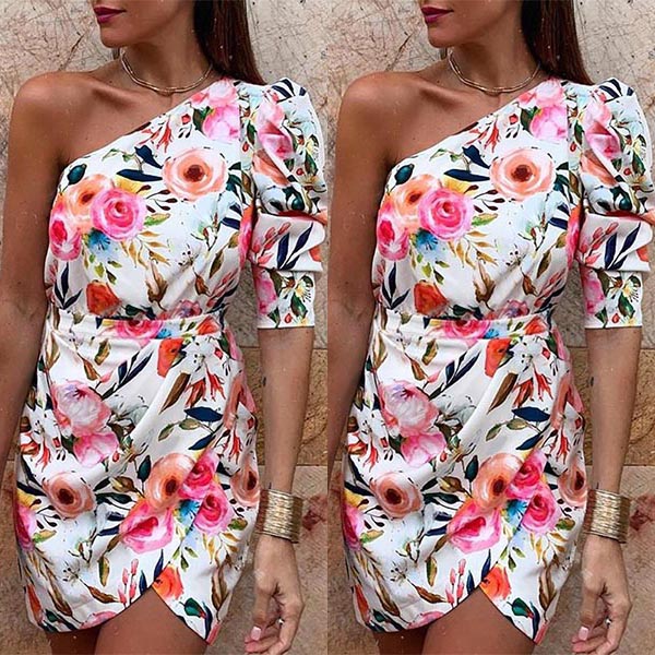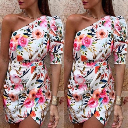 Sexy One-shoulder Half Sleeve Slim Fit Printed Dress