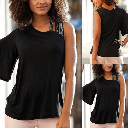 Sexy One-shoulder Trumpet Sleeve Solid Color T-shirt