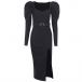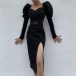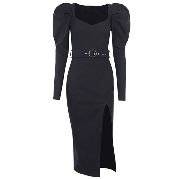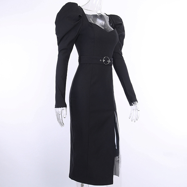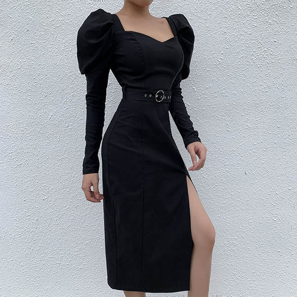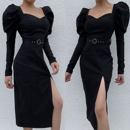For an evening look that is full of poise and elegance,we suggest you choosing this piece! The flattering black tone and fit silhouette design can showcase your perfect figure,while the puff sleeve,square collar and slit hem design will further enhance its charm. Simply need to match with your sexy heels and elegant clutch,then you can look stunning enough!