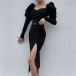Sexy Puff Sleeve Square Collar Slit Hem Slim Fit Dress