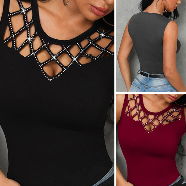 This sleeveless t-shirt is crafted from soft and breathable fabric,which can offer you a cool and comfortable day. In addition,the rhinestone spliced details and hollow out design will make this piece look sexy and flirty. You can simply match it with a shorts to have a wonderful day!