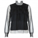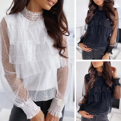 Sexy See-through Gauze Spliced Long Sleeve Stand Collar Dots Top