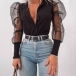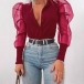 Sexy See-through Gauze Spliced Puff Sleeve Deep V-neck Top