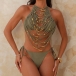 Bikiniset – självknytande halterneck i sexig design med guldfärgade pärlprydda fransar