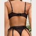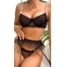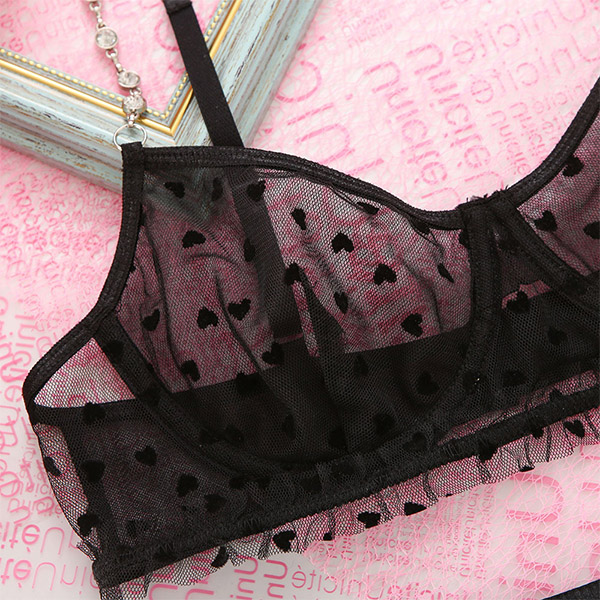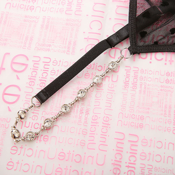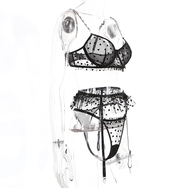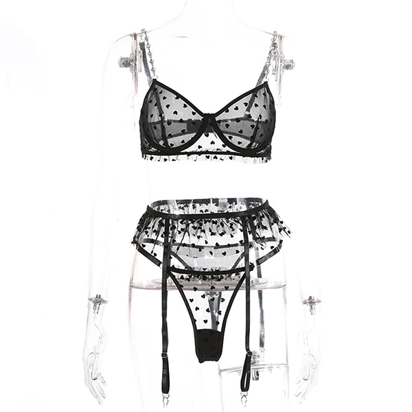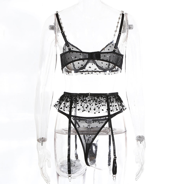 Sexy Semi-through Gauze Spliced Heart Printed Rhinestone Chain Three-piece Lingerie Set
