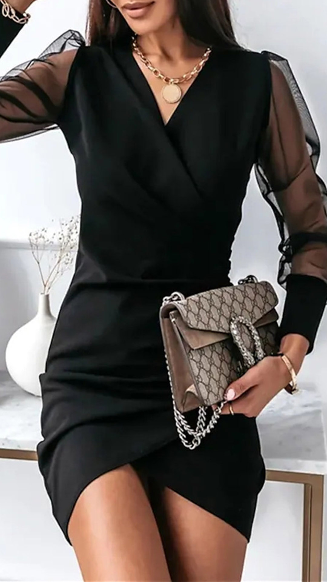 This Sexy Bodycon Dress is the perfect way to show off your curves and flaunt your style. With its semi-transparent gauze spliced design and irregular hemline, this dress is sure to turn heads.
