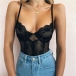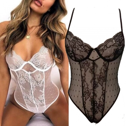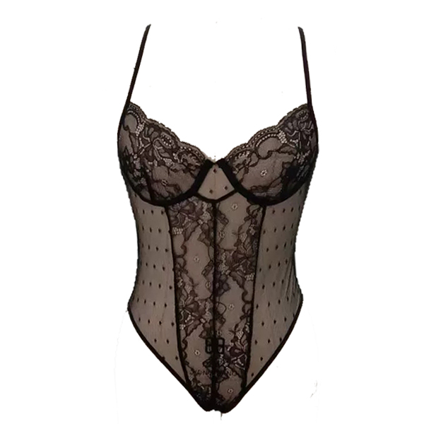Sexig V-ringad rygglös spetsunderkläderbody med halvgenomgående design